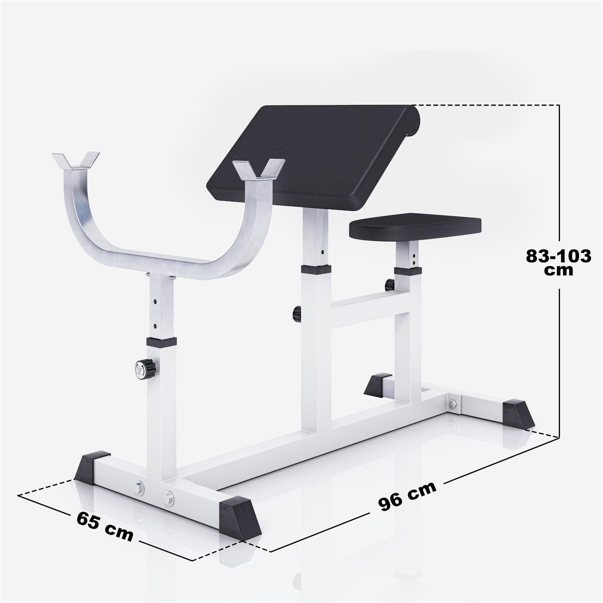 Bei der Curlbank Weiß profitierst Du durch die Positionierung von Armpolster und Sitzfläche, da dein Körper stabil fixiert ist und Du Deine gesamten Kräfte in das Isolationstraining des Bizeps lenkst.