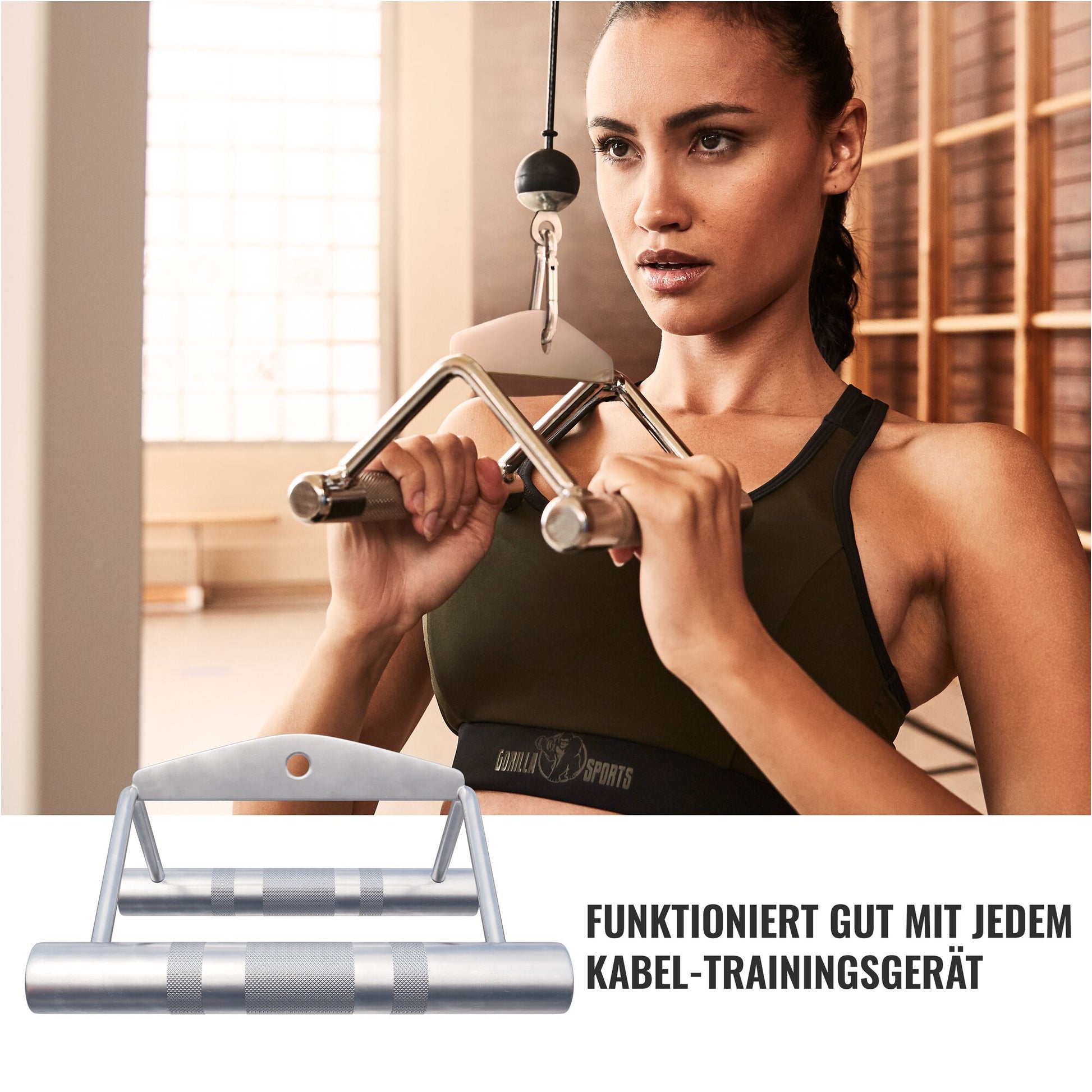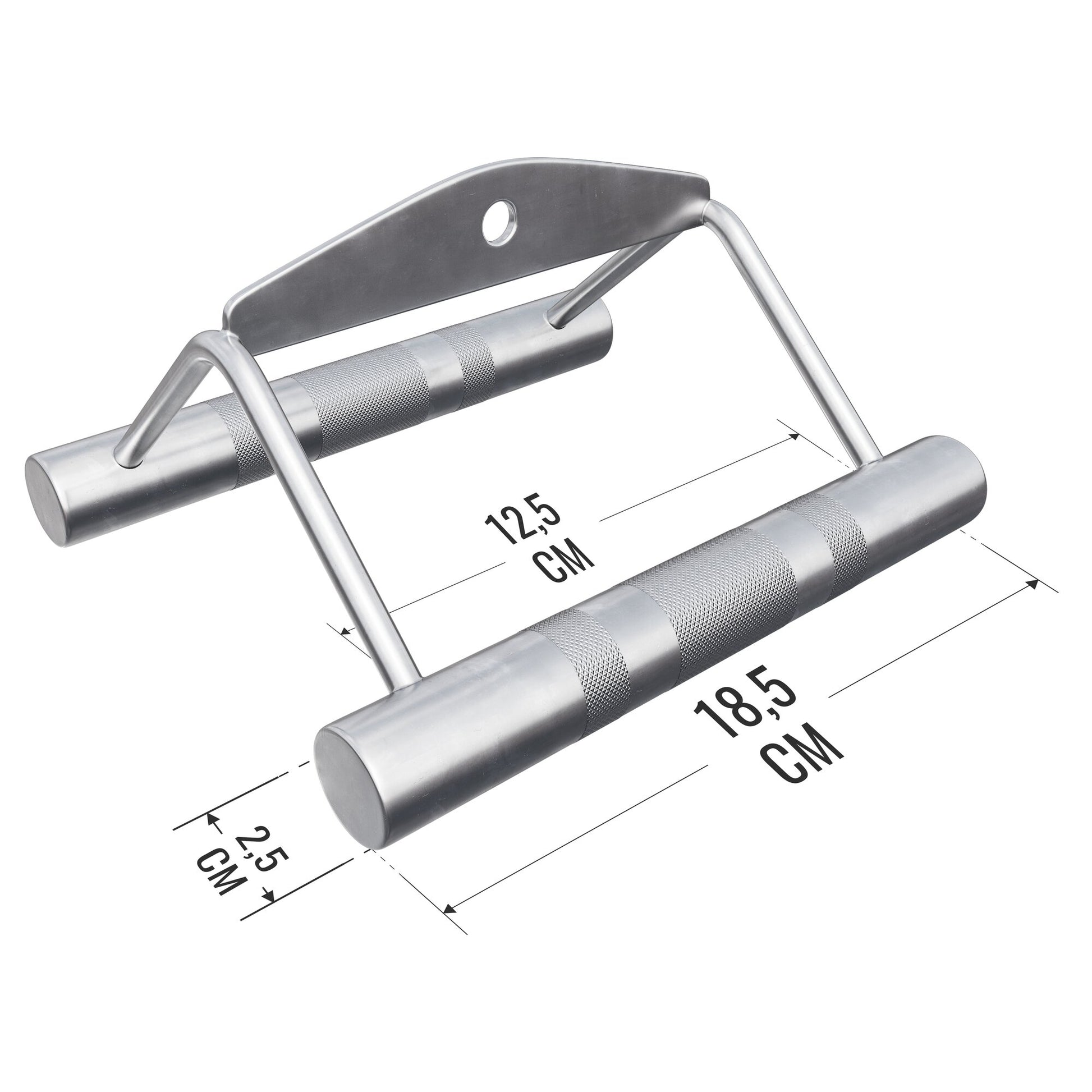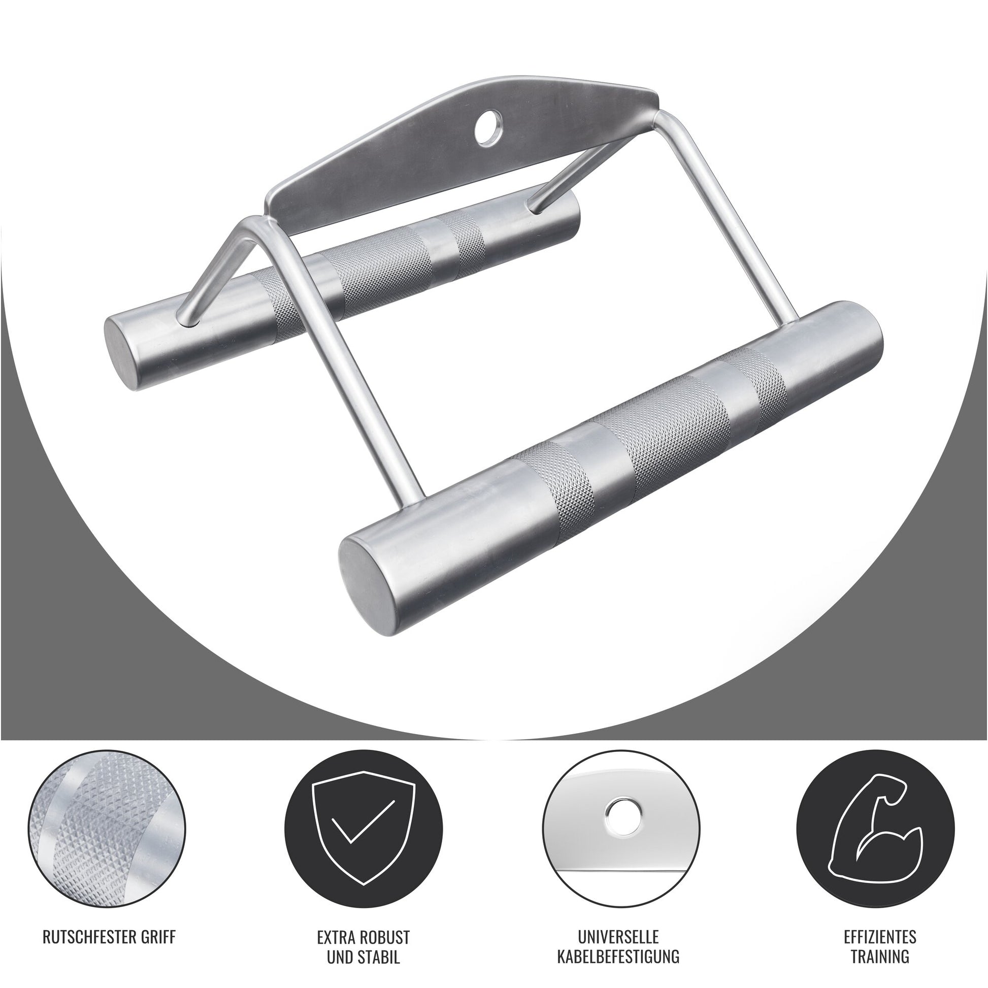 Der Rudergriff ist aus qualitativ hochwertigem Chrom gefertigt und stellt damit echte Studioqualität für Deine Heimfitness dar. Damit er besonders stabil und robust zum Einsatz kommen kann, weist der Rudergriff keine hohlen Stellen oder Röhren auf. Er besteht aus Vollmaterial. Die Öse an der Oberseite des Griffs ist stabil und passt in jeden standardisierten Haken der typischen Maschinen und Stationen. Die spezielle Rändelung an den Griffen ist so entworfen, dass Du jederzeit volle Kontrolle über den Griff hast und auch mit nassen Händen nicht abrutschen kannst.
